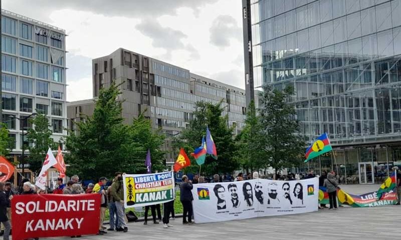 Comme à chaque audition, un rassemblement de soutien a eu lieu sur le parvis du Tribunal de justice de Paris de 9h à 12h. Le sénateur Robert Xowie et la député LFI Mathilde Panot étaient présents. Une quarantaine de militants du Mouvement des Kanak en France et des différentes composantes du Collectif Solidarité Kanaky, dont des camarades de notre parti, se sont relayés pour tenir les banderoles et distribuer un tract d’information sur la situation imposée aux prisonniers politiques kanak et sur le combat du peuple kanak pour son indépendance.