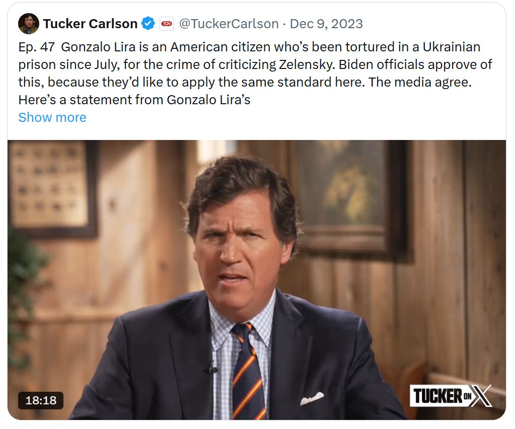 Le 9 décembre 2023, le journaliste indépendant Tucker Carlson écrit : « Gonzalo Lira est un citoyen américain qui a été torturé dans une prison ukrainienne depuis juillet, pour le crime d’avoir critiqué Zelensky. Les responsables de Biden approuvent cela, car ils aimeraient appliquer la même norme par ici. Les médias sont d’accord. ».