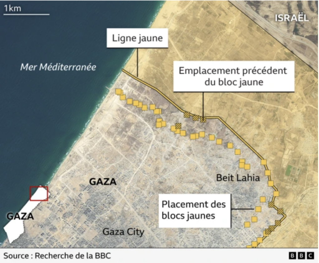 Le chef de l’opposition Yaïr Lapid a déclaré qu’Israël devrait créer dans le sud du Liban une zone totalement dépeuplée et bombardée à plat, explicitement comparée à la ligne jaune à Gaza, où Israël a « coupé l’enclave en deux » : d’une part une bande côtière vers laquelle les Palestiniens ont été expulsés, d’autre part une zone occupée où des démolitions systématiques ont lieu et où l’on tire sur ceux qui tentent de traverser.